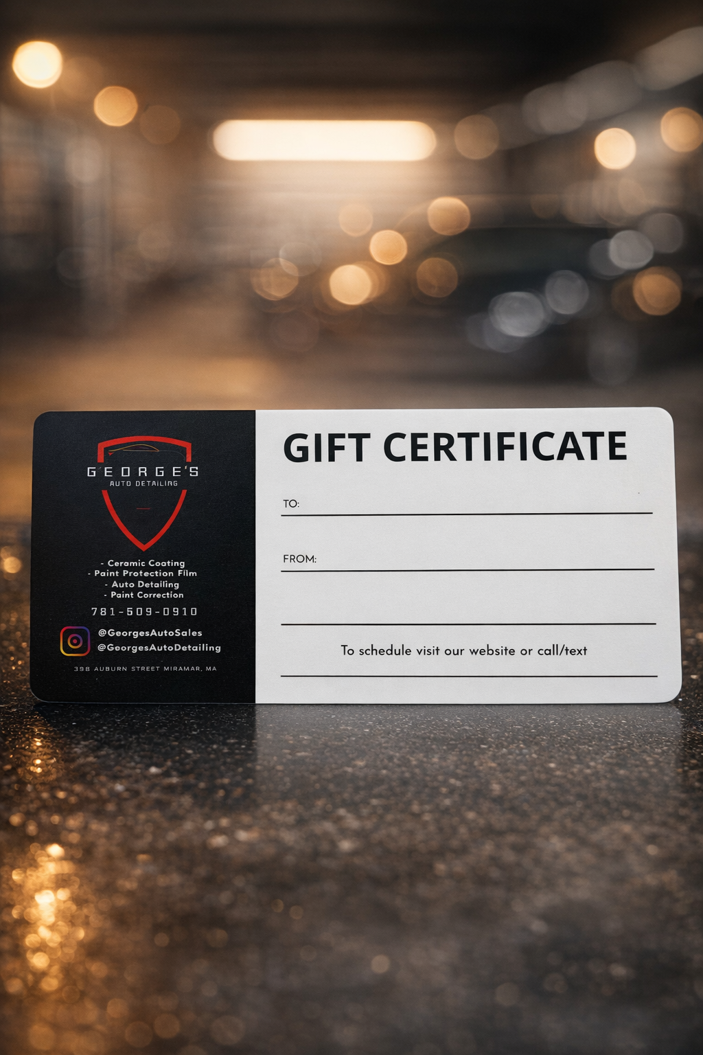 Please Call/Text George at 781-530-0910, or email Gelwellautodetailing10@gmail.com to request a gift card. Gift cards can be picked up or delivered and paid with venmo/cash/check, or mailed with payment through venmo.